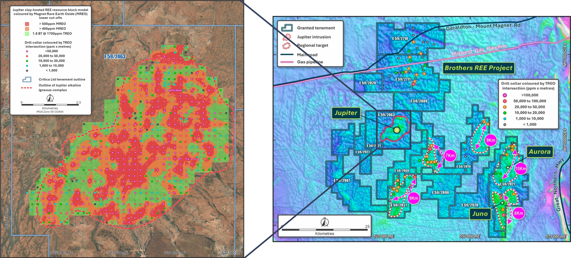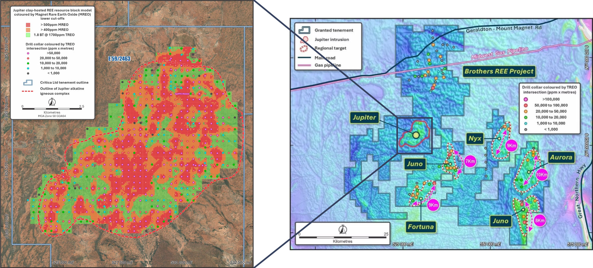 - District Growth Potential: Jupiter forms part of Critica’s 100%-owned Brothers Project, which hosts multiple REE discoveries including Arora and Juno — both showing Jupiter-style geochemical and geophysical signatures, highlighting broader resource potential.
